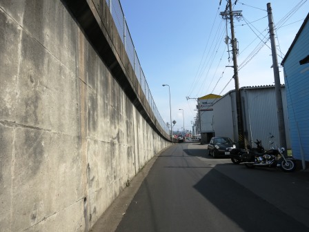 国道21号線は各務ヶ原駅前をとおり、その先 でJR高山本線をまたぐ陸橋となる。JR線を越えた南側に「播隆上人の碑」があるということで、陸橋の右側を進んで、JR線を越えたらすぐに階段で降り、国道下の側道を進む。(右写真) 右側の工場の建物の間に、碑が建っている。 「旅人道中安全」の石碑も建ち、このあたりに、一里塚があった、という。 |