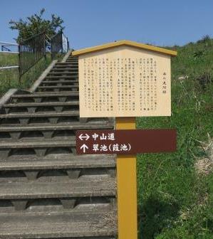 少し先左手に翠池の土手があり、階段わきに「西見附跡」の説明板がある。 遺構はないが、鵜沼宿家並み図と今の地図をあわせると、このあたりだったという。高台に位置しており、右手の先には、小さく犬山城がみえる。 鵜沼宿は、天保14年(1843)で、本陣1、脇本陣1、旅籠25軒、総家数68軒で、東西約800mの町並みであった。 |