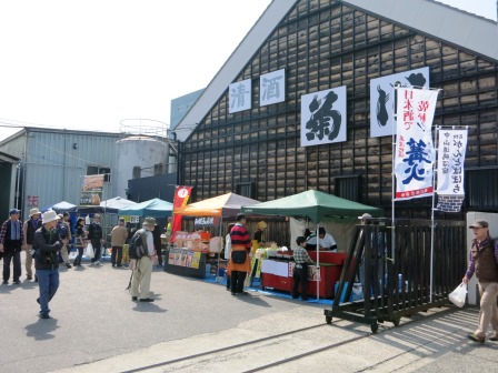 左手の石段をのぼると、二ノ宮神社で、本殿を囲む石垣に、石室が見える。この神社は、古墳の上に 建てられたもので、直径29mの円墳という。向かい側は、明治4年(1871)創業の菊川酒造があり、土曜日の為多くの人でにぎわっていた。 |