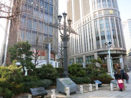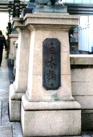 三越新館前に行く。 日本橋北西詰に 広場がある。まず目につくのが、高さ約7mの鉄柱である。 真ん中に大きく「東京市道路元標」との文字が表示されている。もとは、日本橋の中央に建てられ東京都電の架線の柱として使用されていたが、都電廃止後の昭和47年(1972)の道路改修にt伴い、この場所に移されたものである。 東京市道路元標のあった場所には50cm四方の日本国道路元標が埋め込まれている。 ![]() そのレプリカが、この広場に置かれている。 |