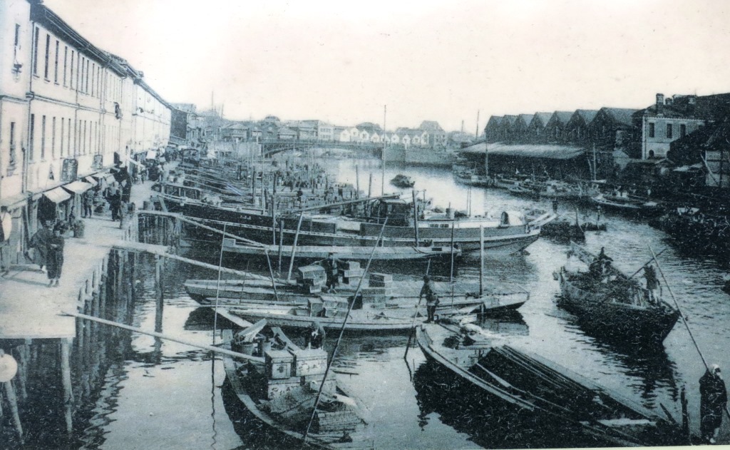 北東詰には「日本橋魚市場発祥の地」の石柱と「魚河岸跡」の説明板が立っている。 「日本橋から江戸橋にかけての日本橋川沿いには 「魚河岸」があり、本船町、小田原町、按針町の広い範囲で、魚市が開かれ、大変なにぎわいを見せていた。佃島の漁師たちが将軍や諸大名へ調達した残りを売り出したことにはじまる。」という。 大正12年(1923)の大震災の後、築地に移り、東京中央卸売市場へと発展した。 <震災前の魚河岸-奥は江戸橋> 説明板の写真 |