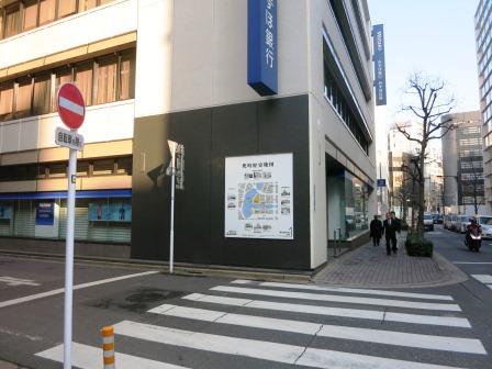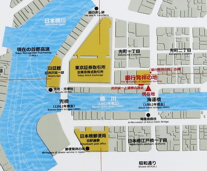 首都高都心環状線の下を進むと、みずほ銀行がある。建物の角の壁に大きな「兜町歴史地図}が掲げられている。(クリックすると拡大)![]() みずほ銀行の建物の南東角に、「銀行発祥の地」のレリーフがある。 明治5年(1812)の国立銀行条例に基づいて、三井八郎右衛門ら8名の出願により、翌年日本で初めて「第一国立銀行」が建てられた場所である。 |