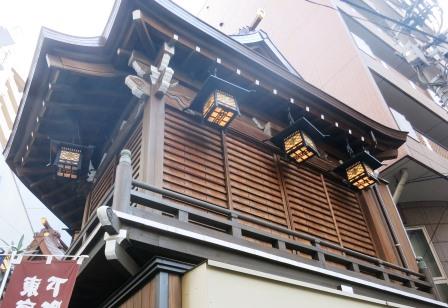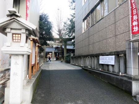 100m程南の細い路地が日枝神社の参道で、奥に鳥居が見える。千代田区永田町にある山王日枝神社の日本橋摂社である。 天正年間(1573~92)より、日枝神社の祭礼に八丁堀北嶋(鎧島)祓所の御旅所まで神輿が船で神幸したことに始まるという。 神仏分離令により、薬師堂と智泉院が敷地から分離された。 |
