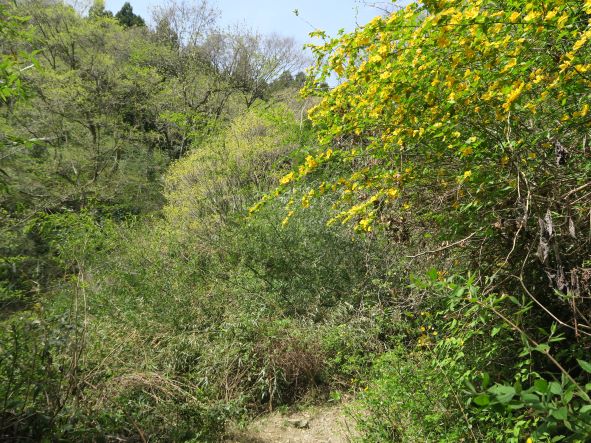 峠からの下りは、V字形のあるきやすい道が続くが、そのうち急な坂道となり、ようやく 、そのさきで、高い中央高速のあ橋げたの下をくぐる。 |