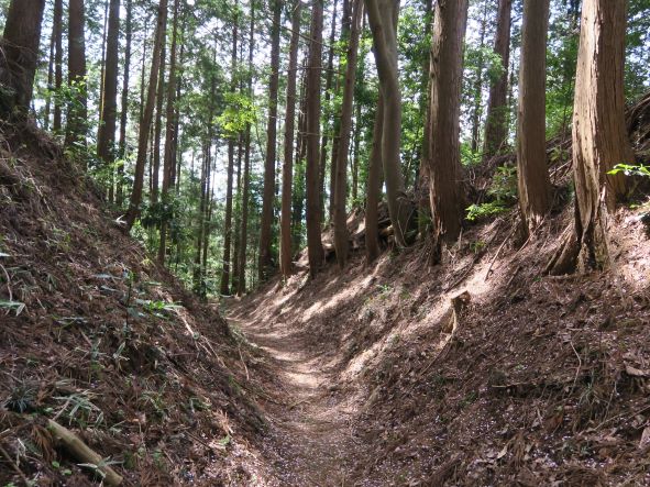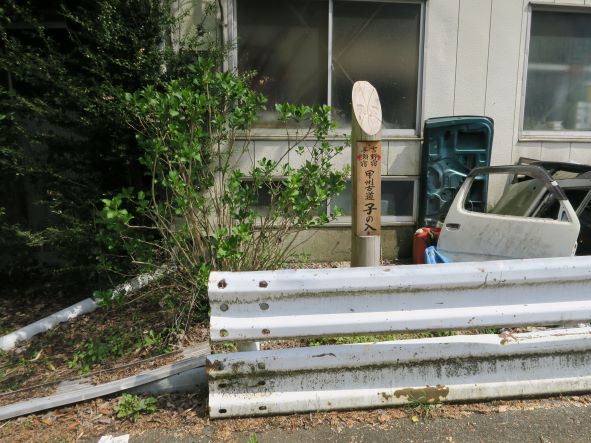 鳥居から西に向かい、中央高速の下をくぐり、国道に合流する。すぐに右に向かい、山のほうに進むのが本来の道であるが、その先で消滅している。 そこで国道をすすみ、中央高速をくぐったあとすぐを、斜め右に入る坂を、100mほど上がっていくと、三叉路があり、右側から来た旧街道と合流する。 甲州道中「横道」と書かれた標柱が建っている場所の少し手前である。 |