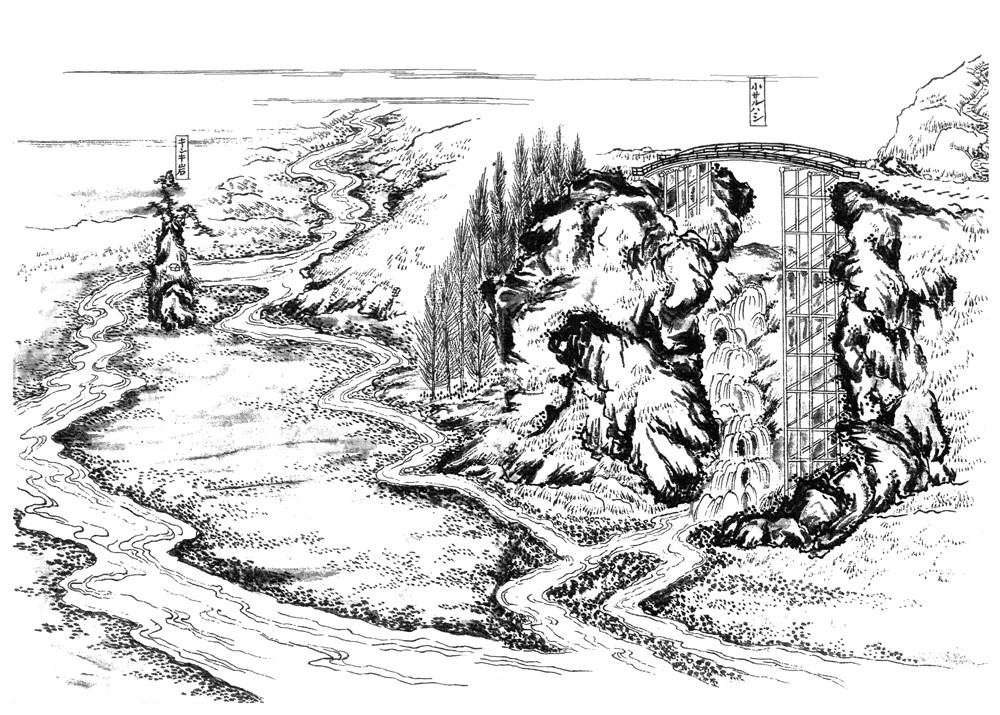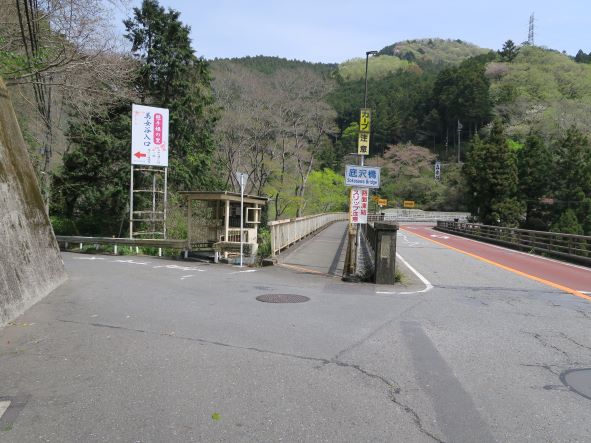 吉野橋の手前左側に、自然石に刻まれた廿三夜塔や半分に欠けた百万遍供養塔?が残されている。そのわきに古猿橋の説明板がある。 それによると現在の吉野橋よりやや南寄りに、子猿橋という欄干付きの板橋が、架けられていた。 長さ14間(約25m)、幅2間(約3.6m)、高さ5丈8尺(約25m)という。 この先にある猿橋と工法も形も同じで、その規模が少しちいさいことから、「小猿橋」と呼んだという。 <小猿橋の絵> 説明板にその絵が描かれているが、不明瞭なため、「新編相模国風土記」のHPより、引用した。 ![]() (クリックすると拡大) |