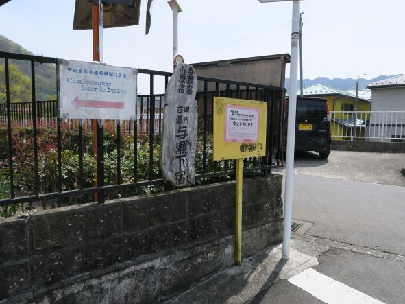 坂をくだり、中央高速の出口に架かる橋をわたり、急坂を下ると、高札場の標柱がある。案内図ー❼ すぐ下で国道20号線に合流する。 |