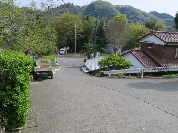 坂を下り、中央高速の架かる橋を渡る。 林の中を過ぎると、右側の斜面が開けてくる。左右に分岐する道を右へ下る。 右手に自治会の案内板と共に甲州道中「赤坂」の標柱がある。案内図ー❷ 案内図によると、ここから、右斜めに下る小道があるようだ。 それを見過ごして、そのまま進んでしまった。 右手に観音寺の屋根が見えてくる。 |
