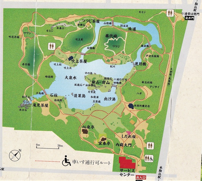 駒込の駅前に六義園の門があり、大きな説明板があるが。 園の正門はここから南に400m程先の右手にある。 六義園は、川越藩主・柳沢吉保が元禄15年(1702)に築園した”回遊式築山泉水”といわれる庭園である。明治に入り、三菱財閥の創業者岩崎弥太郎の別邸となり、 その後東京都に寄付された。 中心にある大泉水と呼ばれる池の周りを廻って景色を楽しめるようになっている。 六義園の名は、古今集の序にある和歌の分類の六体(そえ歌、数え歌、なぞらえ歌、たとえ歌、ただごと歌、いわい歌)に由来したもの、という。 |