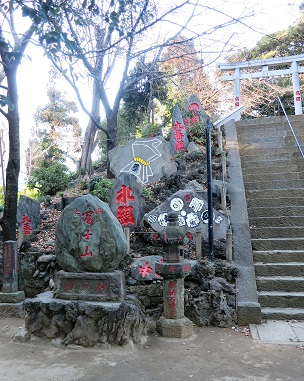 六義園から本郷通りへ出て200mほど先の信号を左に入ると富士神社である。天正元年(1573)に 本郷村の名主が駿河の富士 浅間神社を勧請したのが始まりで、 その後寛永6年(1629)に 加賀藩前田家が上屋敷を賜るにあたり、この地に移転した。 説明板によると、「社伝によればm延文年間(156~61)にはこの社地は富士塚とよび、おおきな塚があったといい、一説によると前方後円墳といわれる。.} 江戸中期以降、富士講が置く発生し、ここは 「駒込のお富士さん」と呼ばれ親しまれてきた。 <富士塚の途中にある庚申塔> <供養塔> ![]() 境内の説明板には、「江戸の人口増に伴い、大名は国元から百姓を呼び寄せ各種野菜が生産され 大消費地江戸の供給基地となった。 ここでは「駒込ナス」が庶民に好まれた」 という。 |