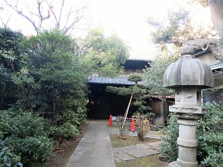 本郷通りに戻り、次の交差点 文京九中入口を、左に入り、天祖神社方面に進む。 神社の鳥居の直前を左に入り、少し進んで右手に入る細道に小さな説明板がたっている。その奥に、全く目立たない形で、古めかしい門が建っている。 ![]() 説明板によると、上駒込村の名主役を勤めていた高木家の屋敷跡という。薬医門形式の表門は、宝永年間(1704~11))のもの、家屋は享保2年(1717)に再建された、と伝えられる、という。 門の脇の木戸から入り、家屋の外側まで見ることができる。 |