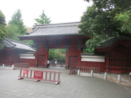 赤門とは、江戸時代、大名家に嫁いだ将軍家の子女またはその住まいを御主殿と呼び、その御殿の門を丹塗りにしたところから、一般に赤門と呼ばれた。 現在残っている唯一のものが、この東大前の赤門という。 ここはもともと加賀藩前田家の上屋敷で、3代藩主前田斉泰(なりやす)が 文政10年(1827)11代将軍家斉の娘溶姫を正室に迎えるにあたり、その前年に造営されたもの。 |