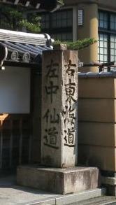 400m程先の変形4叉路の左側に蓮照寺があり、境内の梵鐘の前に、3基の石標がたっている。そのうちの一つが、大きな道標で、享保4年(1719)建立で、「右 中山道」 「左 はちまん道」と大きな字で刻まれている。この先にある朝鮮人街道との分岐点にあった道標がここに移されたものという。 ![]() 道の向かい側にある唯心寺の茅葺屋根の本堂。 |