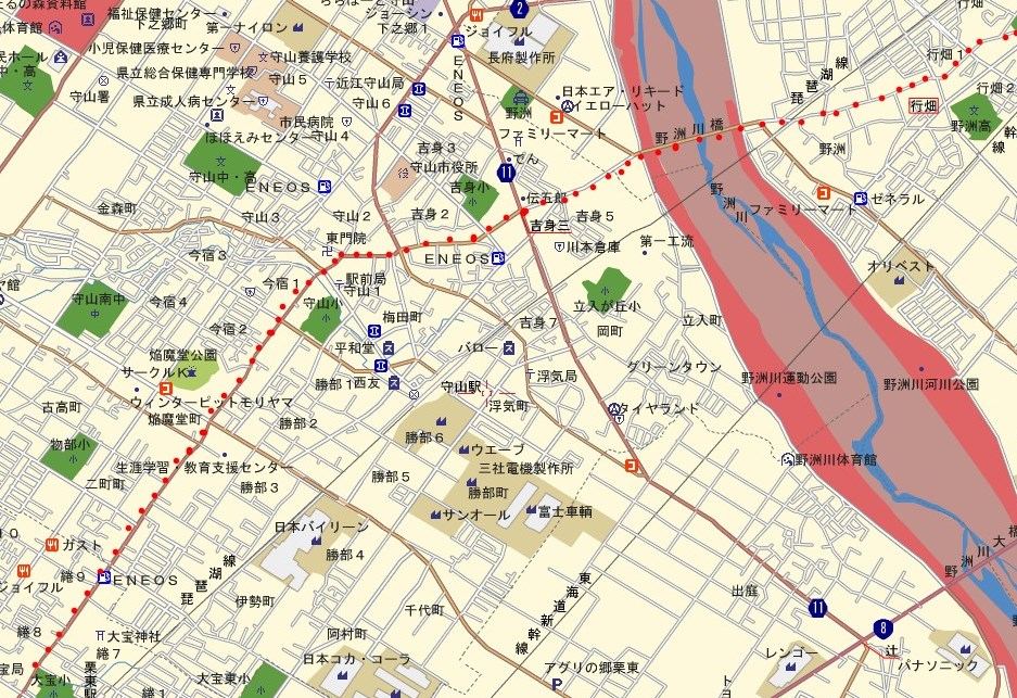 この先に小さな守山川があり、欄干に「中山道守山」 「どばし」かかれた橋を渡る。手前左の樹下神社の参道入り口にたっている石柱によると、 「戦国時代は、瀬田の唐橋と同様に近江路で戦略的に重要な橋で、板の橋のうえに土を盛った橋で、、どばしといわれ、全長 20間(約36m)巾 2間(約3.6m)であった」という。 守山銀座商店街西の交差点を過ぎるあたりから、宿の雰囲気があらわれてくる。 |