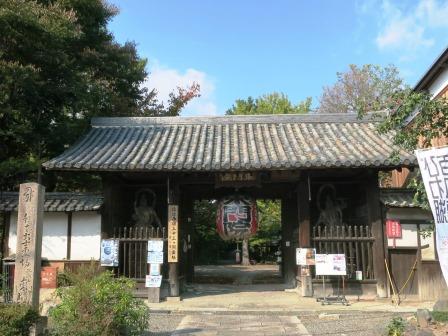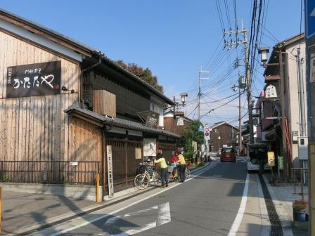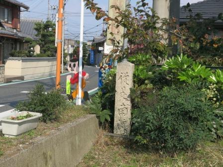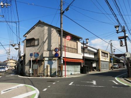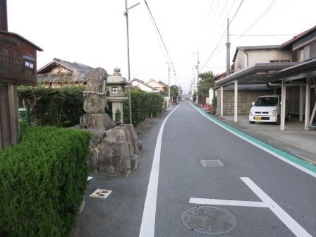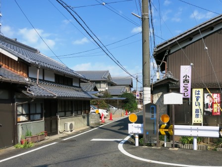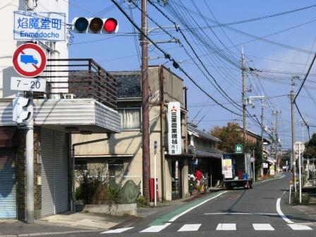 数百m先左に 十王寺があり、門の前に「焔魔法王小野篁御作」と彫られている石柱がたつ。 平安時代前期の公家・文人である小野篁の開基という。 篁は夜ごと井戸を通って地獄に通い、閻魔大王の補佐をしていたという伝説がある。十王寺を建てたとき閻魔大王の像を安置したことから、この付近は焔魔堂村とよばれ、今でも町名に残っている。 ![]() 向かい側の空き地の端に「従是南淀領」という傍示杭がある。 ![]() すぐに、「焔魔堂町」という交差点を通り過ぎる。 その先には古い佇まいの民家もある。交差点から200m程先にJAの建物が見えてくる。その前に一里塚がある。 |
