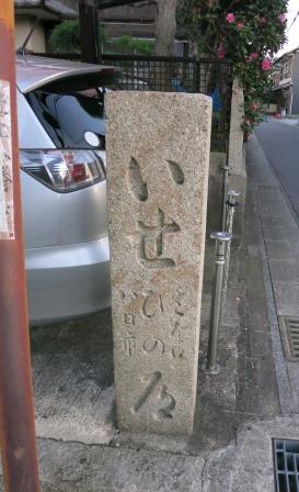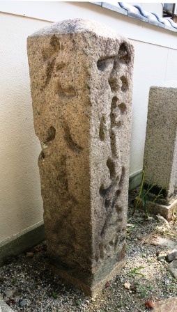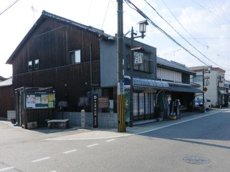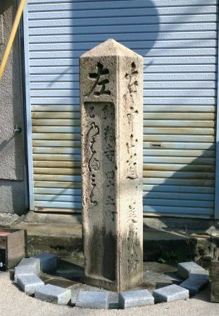 すぐ先の三叉路の正面には保存状態のよいきれいな道標が立つ。、高さ約1.55m一辺約30cmで、延享元年(1744)建立である。 「右 中山道 并 美濃路」「左 錦織寺四十五丁、こ乃者満ミち」と彫られている。 ・・・・「こ乃者満ミち(このはまみち)」とは琵琶湖の津として賑わっていた木浜港へ通じる道のこと。 この地点は 掟書などが掲げられていた高札場の一角でもあったという。道標から右に曲がり宿の中心街に入っていく。 |