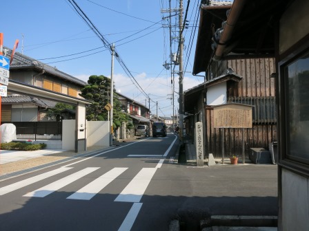 道は緩やかな下りとなる。 鏡は、平安時代から室町時代にかけて栄え た宿場で、中山道が整備されたあとは、宿場の指定からはずれ、守山宿と武佐宿の間の「間の宿」となった。左側には、江戸時代の旅籠加賀屋の跡や、江戸時代の本陣跡の立札がある。 江戸時代、宿駅制度上 間の宿には、宿泊施設は禁じられていたが、ここの場合、紀州侯の宿として、また将軍家の名代などが宿泊することが例外として認められていたようだ。 |