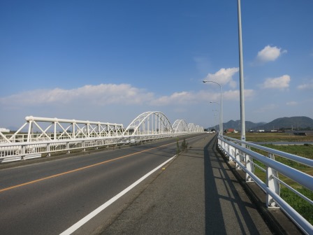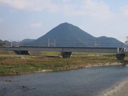 数百mで、野洲川となる。河川敷は広い。 夏・秋は水量が激減し、水量の少ない時は、仮橋で渡し、多い時は舟渡であったという。 上流-南東方向には、旧東海道からも近くに見えた三上山(近江富士)が美しい姿をみせている。 |