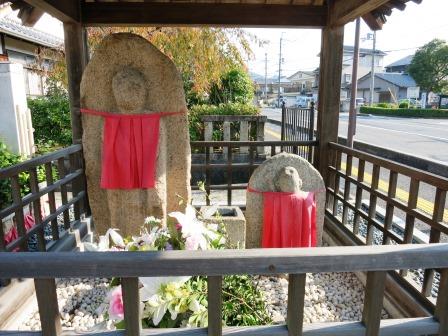 次の広い交差点からも三上山がきれいに見える。渡った右側の小公園に2体の地蔵が並んでいる。右:背比べ地蔵 左:阿弥陀如来立像 両方とも鎌倉時代のもので、『中山道を行き交う人の道中を護ったといわれる。。また、子を持つ親たちが「我が子もこの背の低い地蔵さんくらいになればあとはよく育つ」と背くらべさせるようになり、いつしか背くらべ地蔵と呼ばれるようになった。」という。(説明文より) |