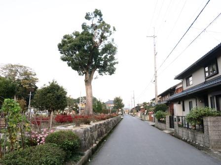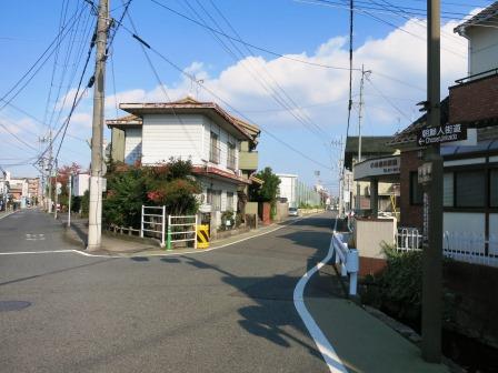 道の景色 小学校前の交差点(5叉路)を東に向かう道を進む。新幹線の高架下をすぎたあと、道は緩やかなカーブで左に、右に進んでいく。 |