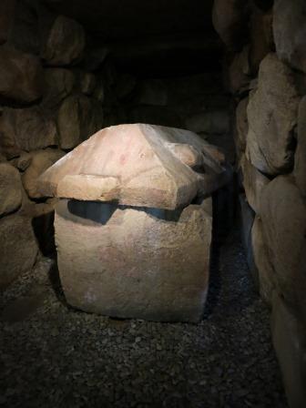 街道に面した山道を登っていくと、甲山古墳がある。ここは標高110mの丘陵先端に造られた6世紀前半の円墳で、直径約30m、高さ10mで、横穴式石室がある。 石室の手前まで穴を進むと柵があり、その奥には、長さ2.6m、幅1.6m、高さやく2mの石棺が納められている。 |