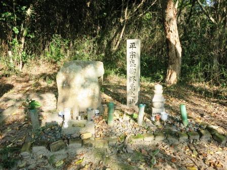 池の東側にある作業場の先に 「平家終焉の地」の白い看板が立っている。 細い道を入っていくと、薄暗い林の中に、説明板と、平宗盛卿終焉之地」の石柱、小さな五輪塔、自然石の2基の石碑がある。平宗盛、清宗父子の胴塚という。 元暦2年(1185)平家一門が壇ノ浦の敗戦で入水した時、父子は死にきれず、義経の捕虜となった。義経の鎌倉行きとともに、護送されていったが、義経は頼朝との面会を許されず、京都に戻っていく。 途中 宗盛、清宗父子は近江のこの地で義経軍に処刑される。 首は三条河原でさらし首にされたが、二人の胴は一つの穴に埋められたという。 |