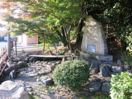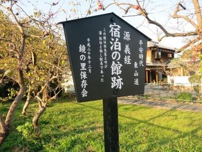少し先には、「平安時代-東山道 源義経宿泊の館跡」の立札と、奥に大きな石碑が立っている。 |