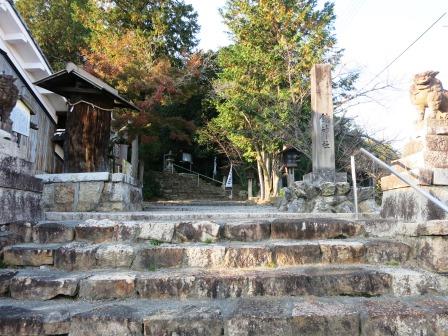 100mほど先に鏡神社の石段がある。創始年代は不詳だが、祭神は天日槍尊(あめのひぼこのにみこと)で、新羅国の王子で多くの技術集団を連れて近江の国に入り、文化を広めたという。 元服した牛若丸は、神社へ参拝、源氏の再興と武運長久を祈願したという。本殿は、蟇股を多用し、屋根はこけら葺きで、室町時代に再建されたものという。 石段左に牛若丸が烏帽子を掛けたという松の切株の一部がある。 |