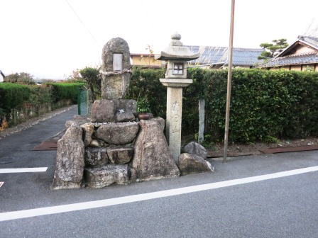 すぐ先の左に入る道の両角に高札場跡の説明板と、愛宕山常夜燈と石碑がある。(説明板は1989年度武佐小学校卒 業生とあり、この先にも多く設置されている。) |