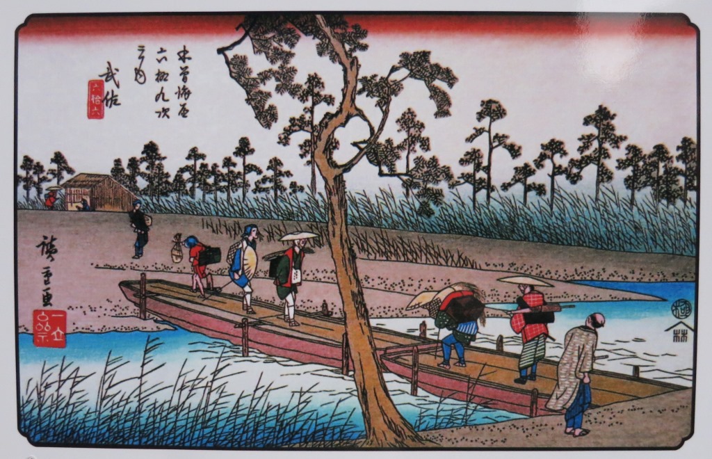 次の交差点で国道から分かれれ右斜めにの細い道を進む。その交差点の角に愛宕山の常夜燈がある。 細い道のすぐ左手には道祖神がまとまっ て祀られている。双体道祖神も多くある。![]() 集落のはずれには江戸時代の旅籠亀谷跡の立札。 国道に合流し、すぐに新善光寺川を渡る。信号のある交差点から、 今度は左に分岐し、田園地帯と住宅地を進む。その先で日野川に突き当たり道は消えているので、迂回する。堤防沿いに国道まで行き、横関橋を渡り、元の道筋までもどることになる。 ここは舟渡で水量が少ない時は二艘の舟をつないで橋として渡っていたという。 (広重の絵-参照) |