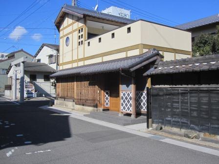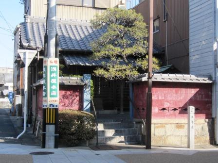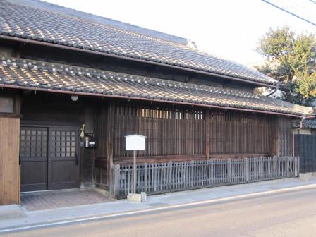 もとに戻り、緩やかに西にカーブしたあと、、近鉄内陸線と並行して、南西にすすむ。 赤堀の駅の手前右側に、連格子の古い建物があり、鈴木薬局(旧鈴木製薬所)の説明板がある。 鈴木家は300年以上も製薬業を営む旧家で、代々勘三郎の名を受け継ぎ現在は十一代を数えるという。現在の家は第六代勘三郎高光が嘉永5年(1852)に建てたものという。 |