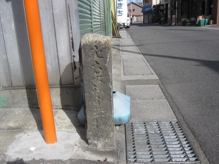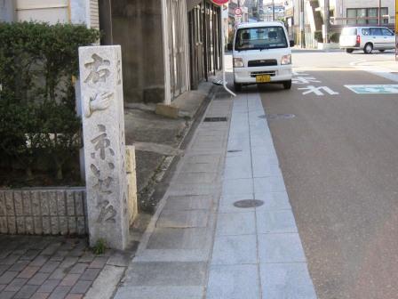 江戸時代から続くという石屋などの店が並んでいる一画に、真新しい石柱がある。「右 京いせ道 左 江戸道」とある道標で、桑名博物館に移されている道標(旧東海道筋にあったもので、もとの場所は不明)の複製版という。 |
