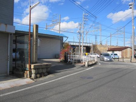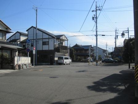 東海道はまっすぐ南に行き、国道を地下道で横切る。道の両側には歴史を感じさせる民家が並ぶ。このあたりは安永の立場があったという。道は右へゆるくカーブしていく。その先の十字路がみえ、さらにその先に、町屋川がある空間のある様子がうかがえる。 |