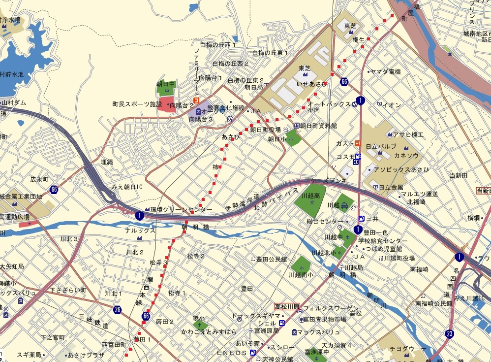 500m程先に伊勢湾岸道の高架の下を通る。その手前 信号のある交差点の北側少し離れたところに存在感のある常夜燈がある。もとは、朝明川の土手にありここに移された多賀大社の常夜燈で、弘化3年(1846)建立である。(多賀大社=古くから「お多賀さん」の名で親しまれた滋賀県第一の大社) 鈴鹿の山並みがきれいに見える朝明川を渡る。四日市に入る。 |