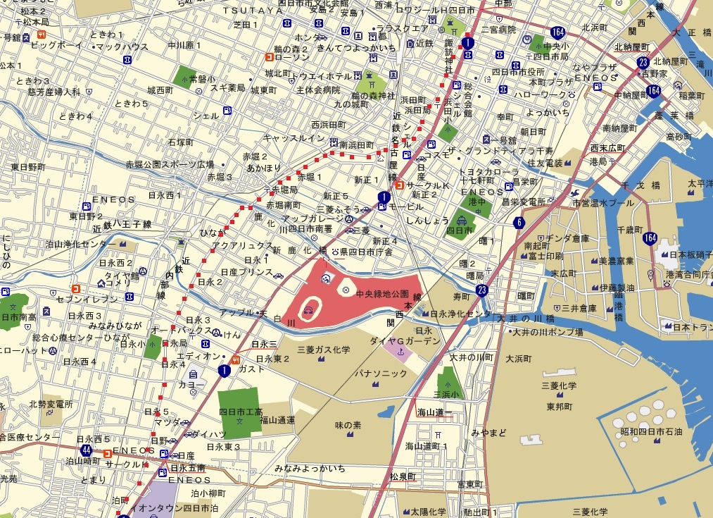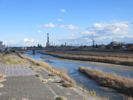 しばらく先の三滝川にかかる三滝橋を渡る。橋の中ほどにあるプレートによると、江戸時代は土橋 であったという。ここから四日市宿となる。天保14年(1843)のデータによると、本陣2、脇本陣1、旅籠98軒、家数1811県という。 下流の先には四日市コンビナートが広がっている。 |