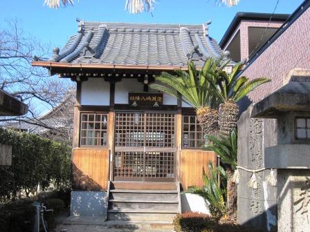 教宗寺、光明寺を過ぎた先,右側に説明板がある。江戸時代以前、桑名は町屋川の流れにより自凝(おのころ)洲崎、加良(から)洲崎、泡(あわ)洲崎の三洲に分かれてあり、この付近は泡洲崎といわれ、 その鎮守であったという。 境内には、天保13年(1842)新町北端に建立されていた道標が移されている。→ 「右 きゃういせみち 左 ふなばみち」 |