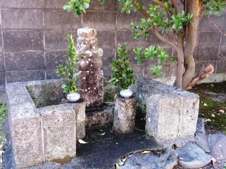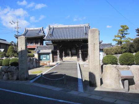 左手の空き地の入り口に「善光寺一躰分身如来」寛政12年(1800)と刻まれた石柱がたち、その奥に地蔵堂や墓地、駐車場がある。説明板があり、ここは、 「江戸時代本願寺村があり、古くからの古刹であった」という。左手には、芭蕉の門人の各務支考(かがみしこう)の分骨供養塔である「梅花仏鏡塔」や、十基ほどの句碑が立っている。 (墓はかがみの名にちなんで、丸い鏡の形をしている) |