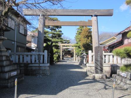 間もなく右手に大宮神明社の大きな森が見えてくる。昔は、ここから南西方向の現在の四日市南高校がある岡山の麓まで海があって、舟付明神があったが、焼けたため、永禄5年(1562)に当時できつつあった東海道沿いに遷ってきたという。 |