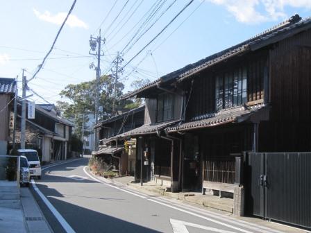 少しカーブした道を200m程すすむ。左側に酒造メーカーの建物のある小道をすぎると、、小さい空き地の前に「松寺立場跡」の説明板がある。大きなエノキの木があり、立場茶屋と呼ばれる茶屋などがあったという。 この先も、往時を偲べる町並みや町並みや、寺がある。 |