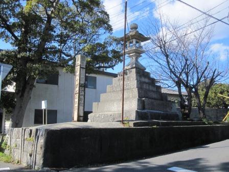 左へゆるくカーブする手前右に石柱と説明板が建ち、皇太子時代の大正天皇が通ったという記念碑である。 その先で直角に右折して50mほど右側角に自動車の排気ガスで黒くなった道標がある。「左 大矢知中学校」と刻まれている。 米問屋で成功した四日市生まれの服部泰次郎が明治から大正にかけて近隣の町各所に多数建立したという。 |