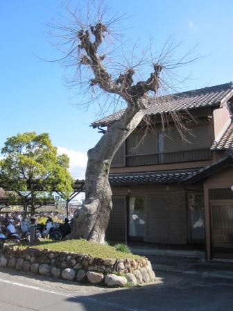 少し先の右へ入る道の角に小さな石柱が立つ。「縄生(なお)一里塚跡」である。![]() 安達本家酒造の酒蔵を過ぎると、伊勢朝日の駅前で近鉄名古屋線の踏切を渡る。そこに朝日町の概要が記された説明板が建つ。 弥生時代以降の遺跡が点在し、白鳳時代創建と考えられる縄生廃寺跡があるという。また、萬古焼を再興した森有節が生まれたところという。 駅のさきには、松並木の中に混じっていたという樹齢300年の榎が一本残されている。 |
