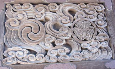 桑名宿のはずれからここまでに、比較的大きな寺院の山門に扉がついており、各々彫刻がされている。 |