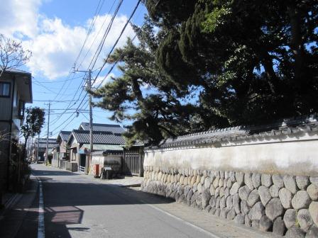 石垣の上に白壁が続く西光寺。しばらく進むと二叉路となり、東海道は左へ行く。このあたりは「柿」という珍しい地名である。 |