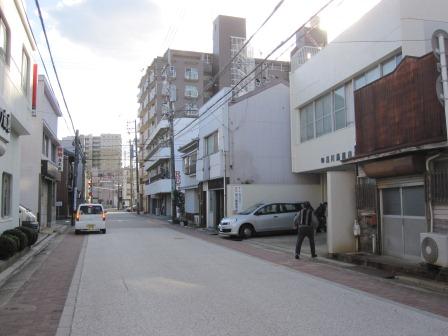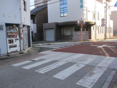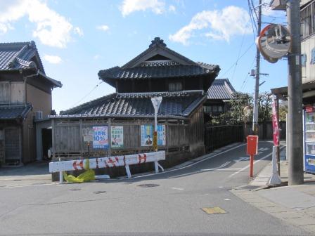 信号を渡ってしばらく行くと、駐車場の角(説明プレートがある)を右折する。 ここには吉津屋門と番所があり、吉津屋見附といわれた。 ここから四角形の三辺を回る枡形道路となっており、石取祭車が通る道でもあるという。 |