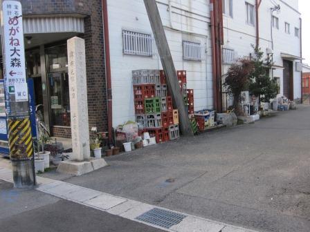 その先で関西本線の高架をくぐり、道なりに左へ曲がって300mほど進んだ先で近鉄名古屋線の高架をくぐって右へカーブする。 その右手の倉庫前に細長い石柱が立っている。「史蹟 冨田の一里塚趾」とある。焼はまぐりが名物の富田は間の宿であった。東海道名所図会には 蛤を店先に山と積み 焼いて売る店が描かれている。 写真は一里塚趾を過ぎたところから振り返って撮った。(左側に石柱) |