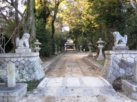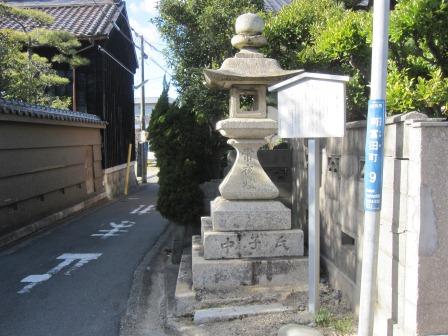 右に入る道に、大きな鳥居と常夜燈が2基あり、ここから西に300m程の志氐(しで)神社の参道入り口である。鳥居は享保18年(1733)、左側の常夜燈は、天保11年(1840)、右側は文政元年(1818)の建立である。 すぐ先には大きな本堂の光明寺があり、文久3年(1863)に造られた旧本堂の鬼瓦が置かれている。 |