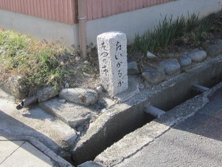 神社から200m程で、近鉄内部線の日永駅に近い十字路がある。すぐ先の右へ入る細道の角に小さな自然石と説明板がある。水沢(すいさわ)道標と呼ばれ、この横の道が水沢方面に通じる道路であったため200年ほど前に建てられたという。裏面に「猿丸太夫名歌古跡すい澤へ是ヨリ三里」とある。 |