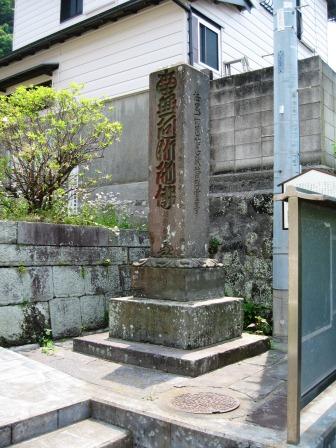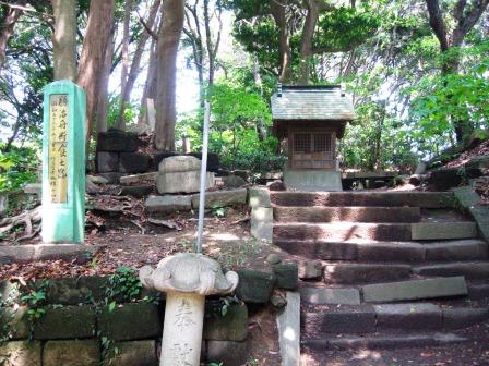 拝殿の脇の「惠仁志坂」と刻まれた石柱のある石段をのぼっていく。 山頂になると、こんもりとした木々に囲まれた広いスペースがあり、本殿の奥の院がたっている。 ここが主曲輪跡であったものと思われる。 <神明社> ![]() ![]() → その一画には東照宮があり、その左手に「勝海舟断食の跡」との標識が立っている。 |
