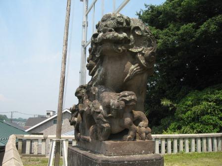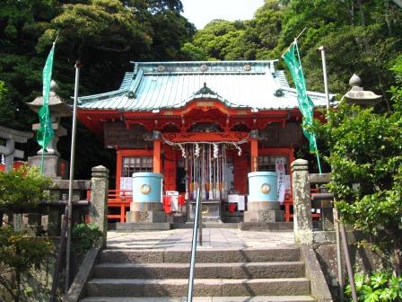 右からの海岸沿いの道と合流する所に、大きな鳥居と山裾に大きな拝殿を構える東叶神社が現れる。養和元年(1181)京都神護寺の僧 文覚が、源氏の再興を願って石清水八幡宮を勧請したのが始まりといい、その後 頼朝にその願いが叶ったことから 叶大明神の名で呼ばれるようになったという。 今の拝殿は、関東大震災の後昭和4年(1929)に竣工したもの。 神社の裏山は標高約50mの明神山で、浦賀 城の跡である。社務所の奥に、勝海舟が断食前に使ったという井戸がある。 安政6年(1859)幕府は日米修好条約の為海臨丸を派遣を決定。 その艦将の勝海舟は、東叶神社に詣り、太平洋横断航海の祈念し断食修行に入ったという。 ![]() 拝殿前から見た浦賀湾。対岸の少し北側には、西叶神社がある。 拝殿前には、子どもを抱いて乳を飲ませている狛犬が建つ。 |