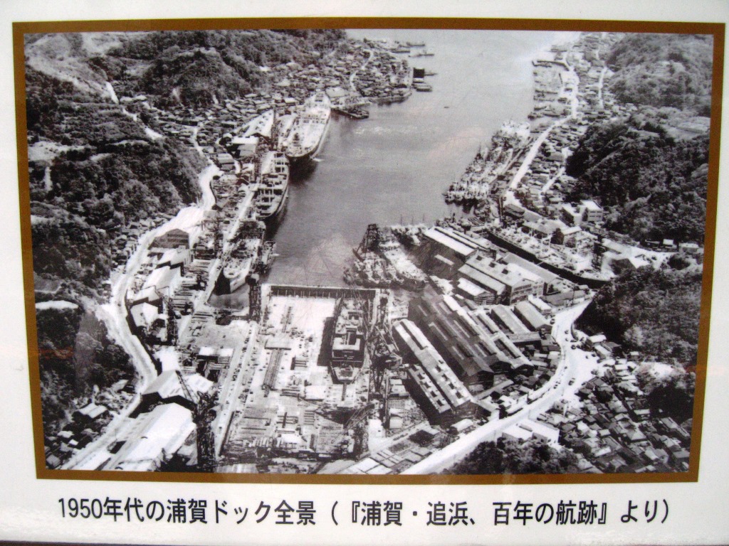(1)浦賀城 浦賀駅近くまで入り込んでいる浦賀港の, 浦賀水道に面している出口の東側の山に浦賀城があった。 駅を出て、浦賀港の東側沿いの観音崎通りを南に向かう。 「浦賀ドッグ」の名前で呼ばれてきた造船所の建物の跡が、海側に並んでいる。 しばらく進んだ「大ヶ谷}バス停前の塀に、「浦賀ドック」の説明板がつけられている。嘉永6年(1853)に、幕府により浦賀に近代的な造船所が開設された。 翌年、日本最初の洋式軍艦である鳳凰丸を建造し、咸臨丸などを修理した。 その後 明治30年(1897)浦賀船渠株式会社が創設され、その後 住友重機械工業となった後、平成15年(2003)に閉鎖された。 (→1950年代のドック全景・・・クリックすると拡大) |